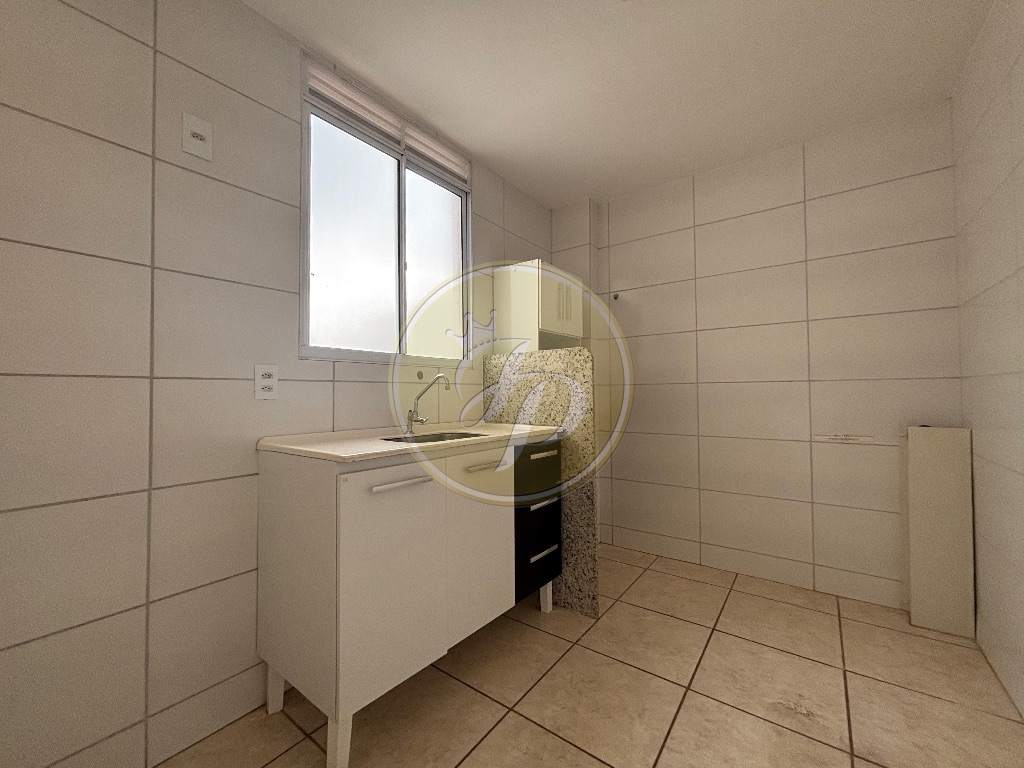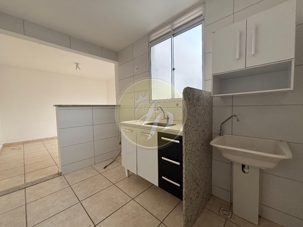 2 quartos, sala de estar, cozinha com armários, área de serviço, banheiro social, 1 vaga de garagem.