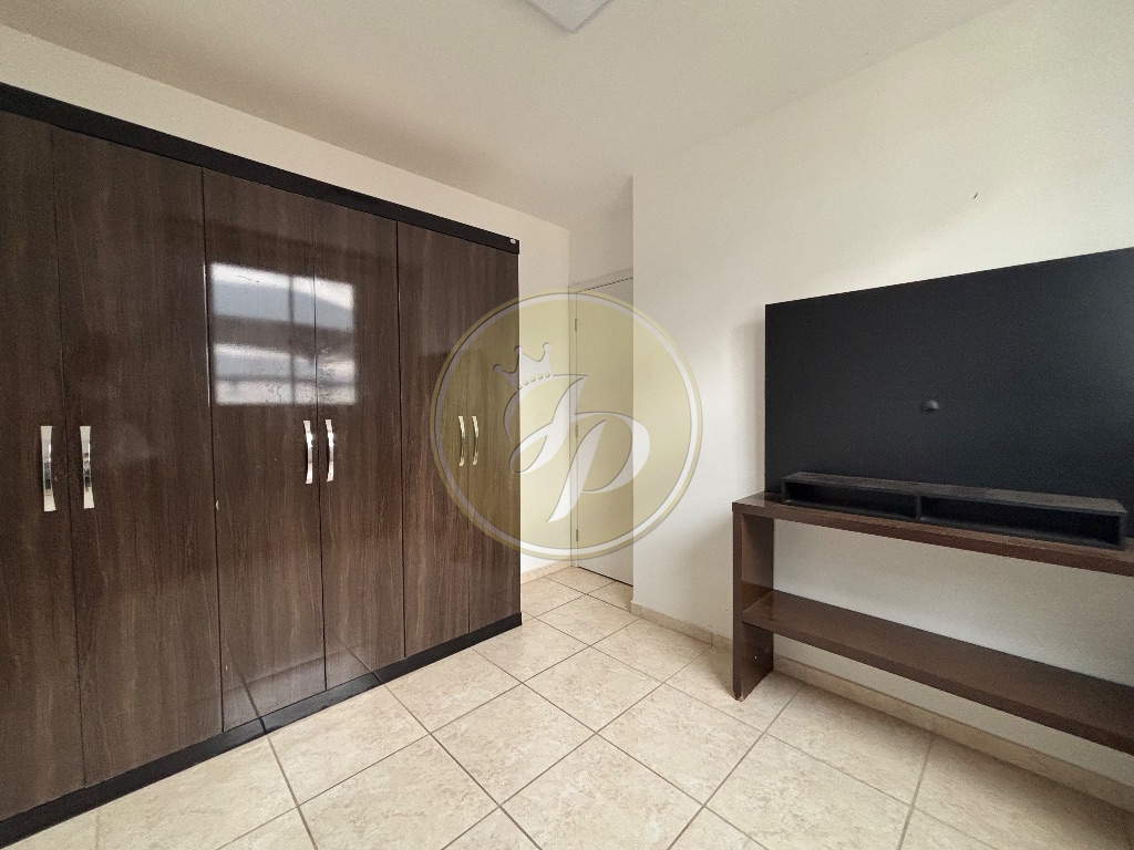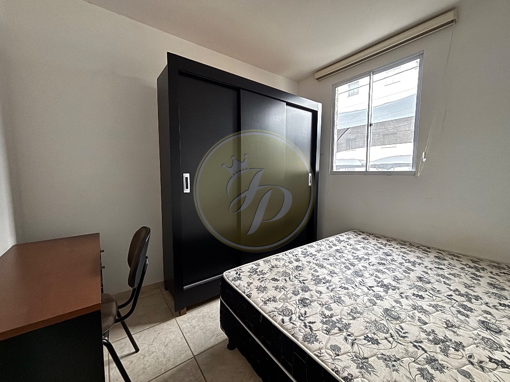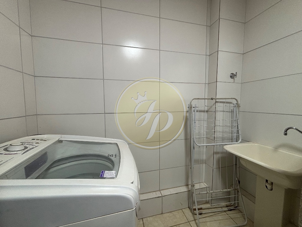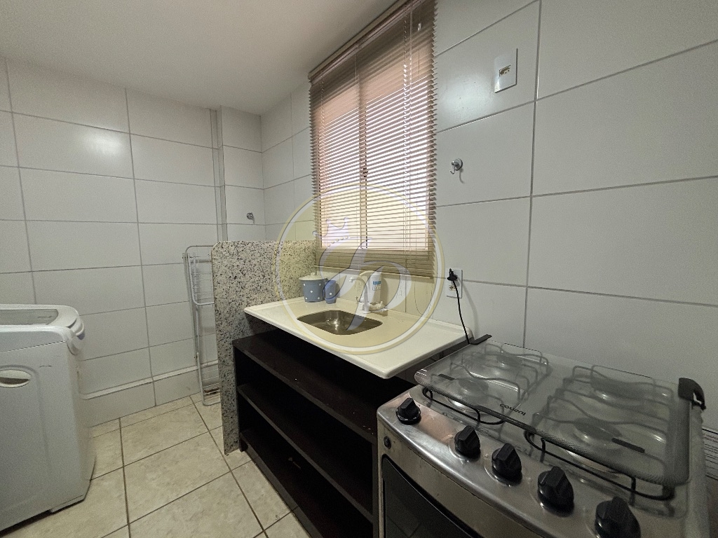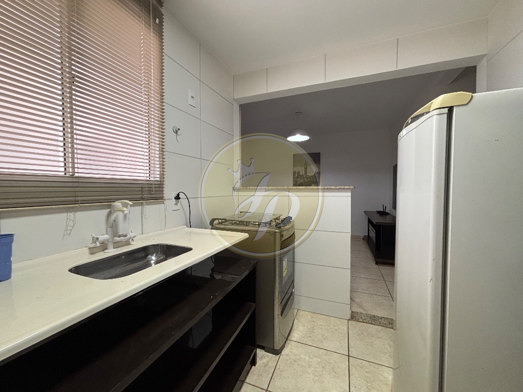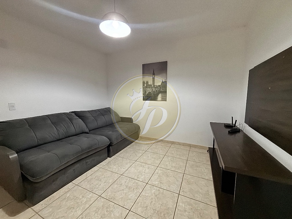 2 quartos sendo 1 com cama e 1 com suporte para TV (ambos possuem guarda-roupa), sala com sofá e suporte para TV, cozinha com fogão, geladeira e armário, área de serviço com máquina de lavar, banheiro social, 1 vaga de garagem.