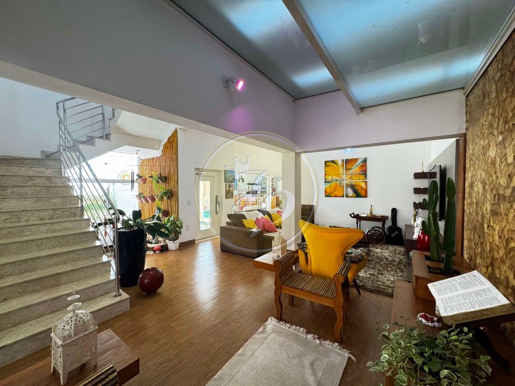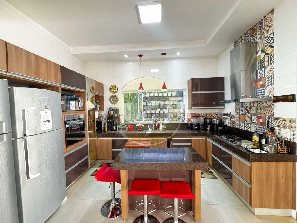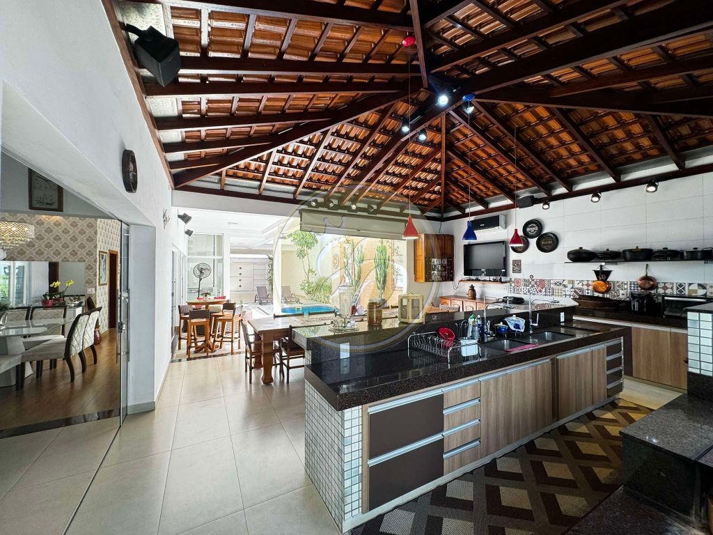 Sala 2 ambientes, sala de jantar, cozinha planejada, banheiro social, lavanderia, escritório, elevador, lago para peixes, área gourmet com churrasqueira e fogão a lenha, piscina com cascata, garagem para 4 carros.