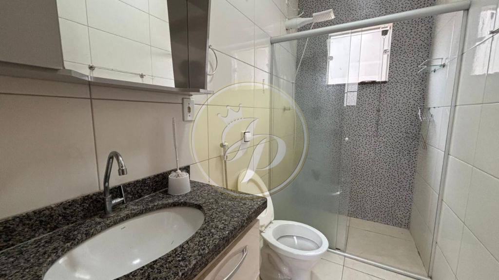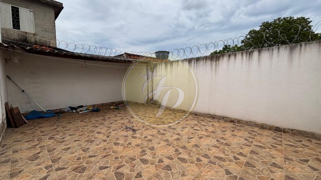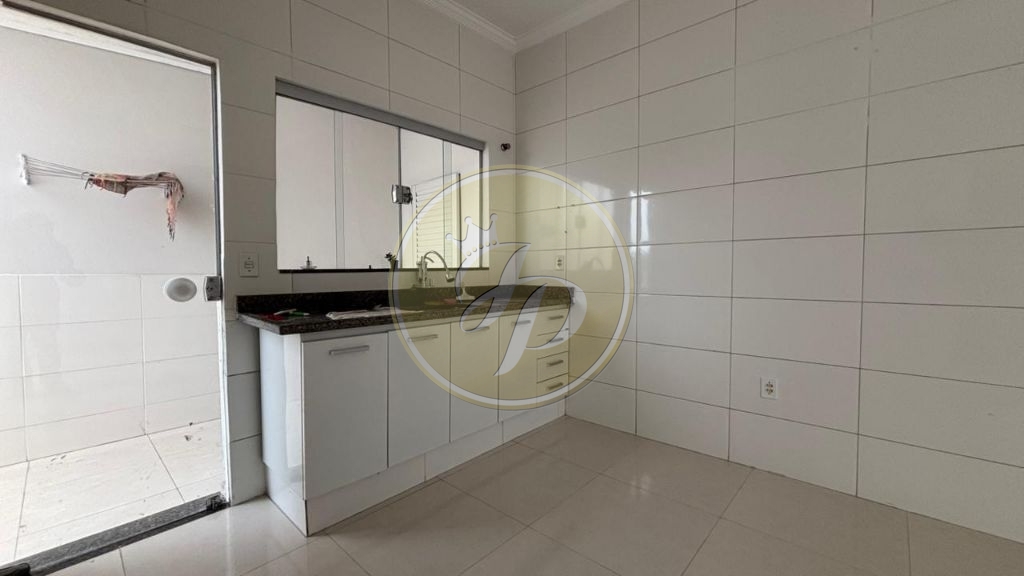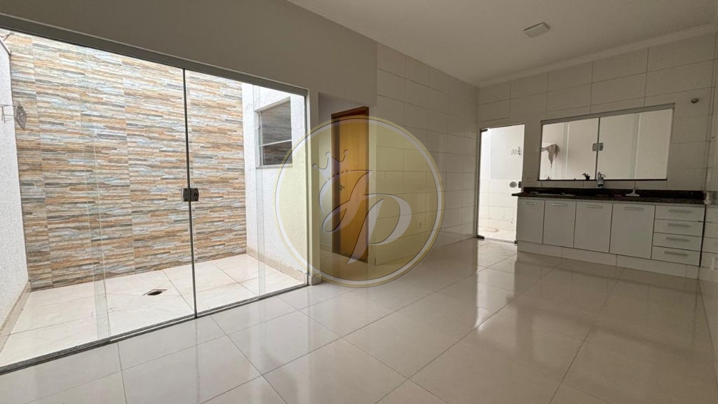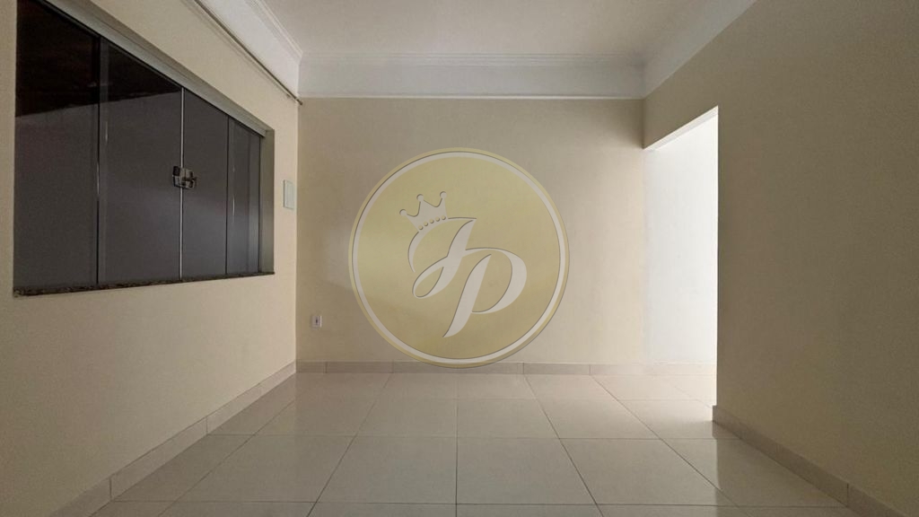 Casa com garagem para dois carros, sala de estar, copa e cozinha, dois quartos, banheiro de visitas, lavanderia e quintal ao fundo.