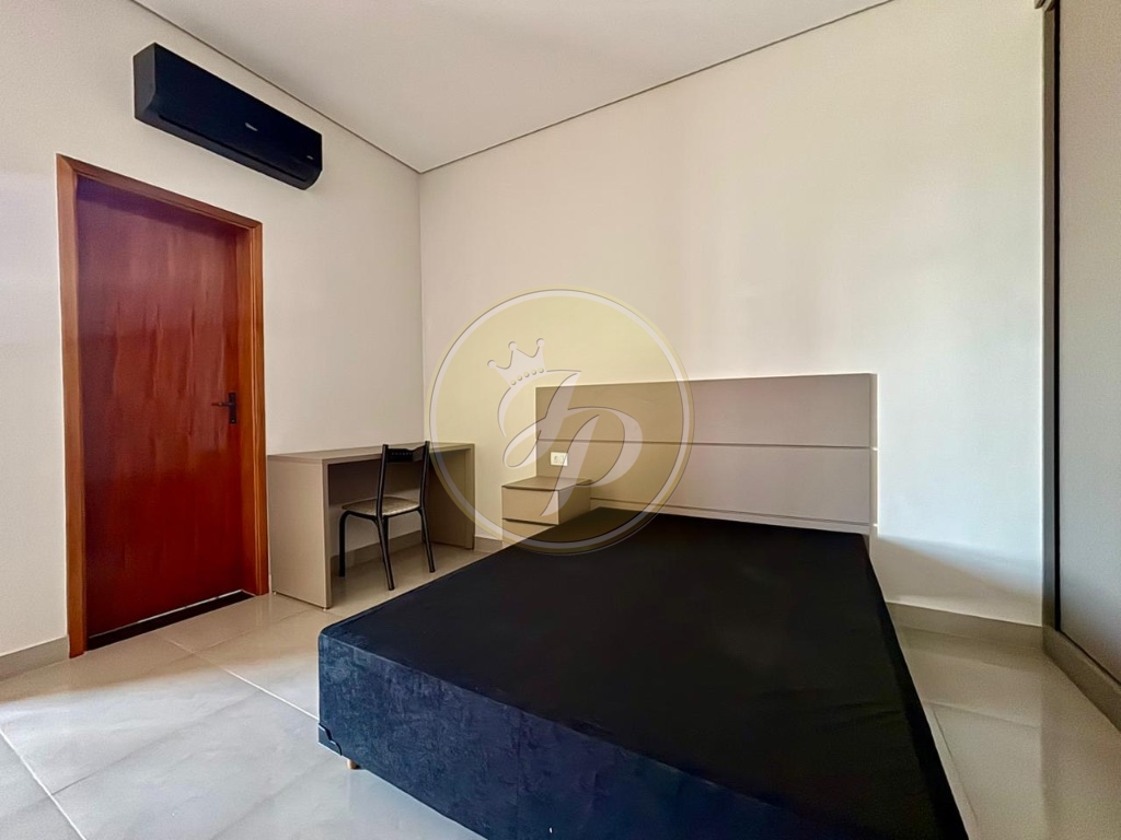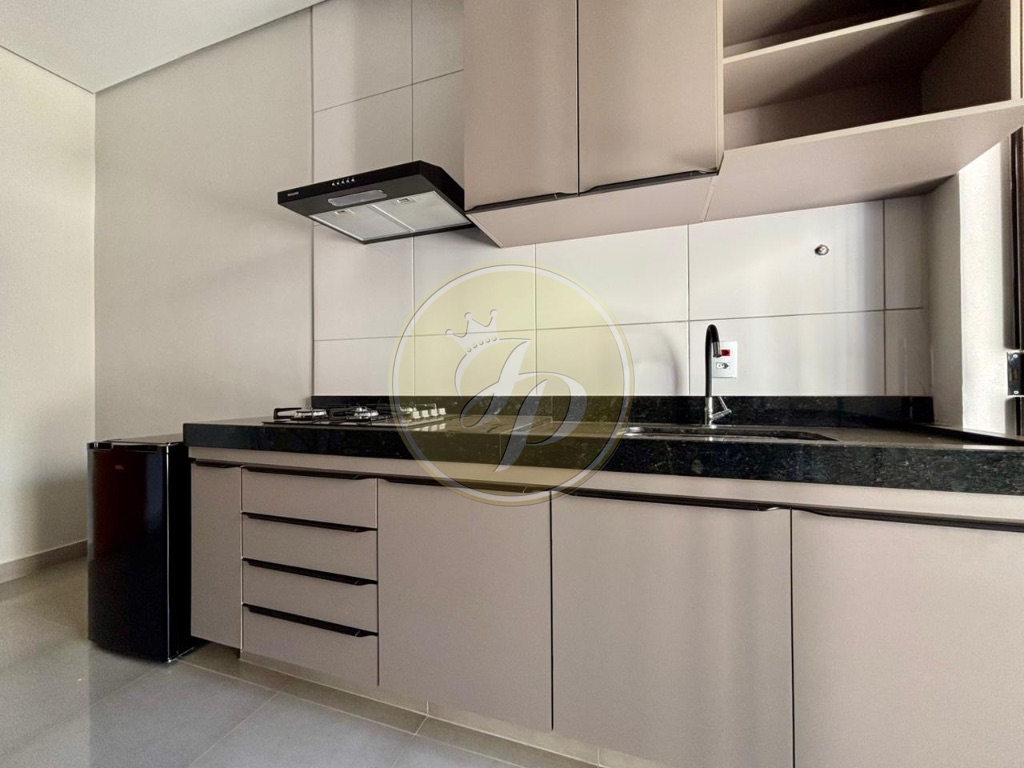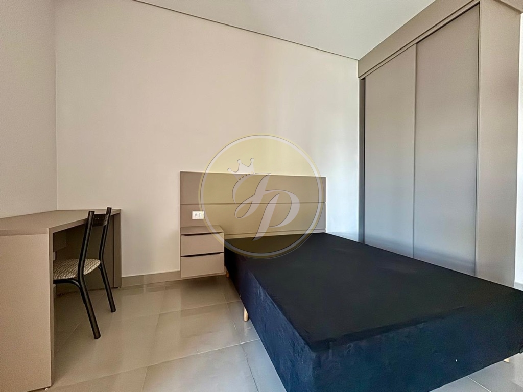 Quarto com armário, escrivaninha e cabeceira planejados, cama, ar-condicionado, cozinha com armários planejados, cooktop, coifa, mesa e cadeiras, sacada ampla com área de serviço, banheiro social, vaga de garagem.