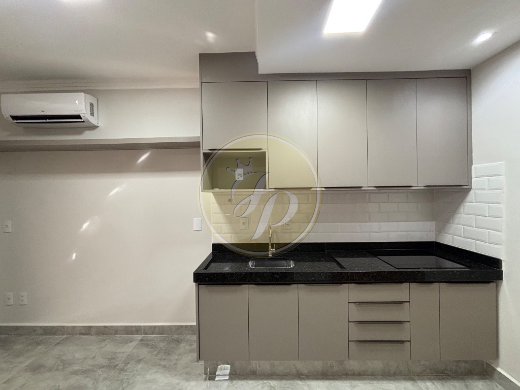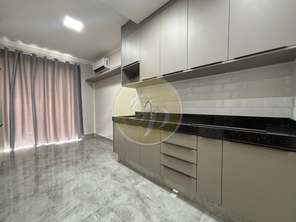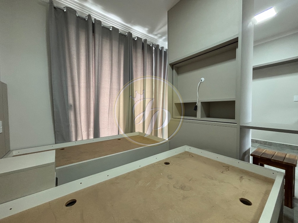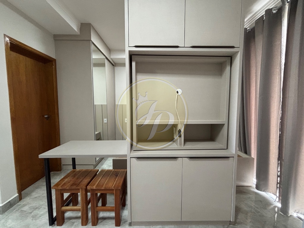 Studio com móveis planejados, bem aproveitado e funcional. Possui duas camas de solteiro, painel de TV giratório, mesa de jantar e cozinha planejada com fogão.