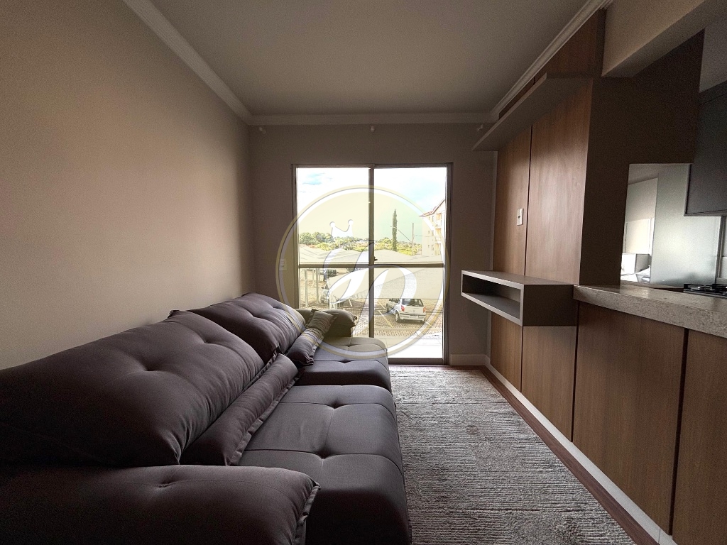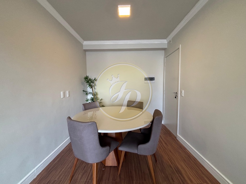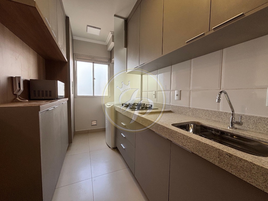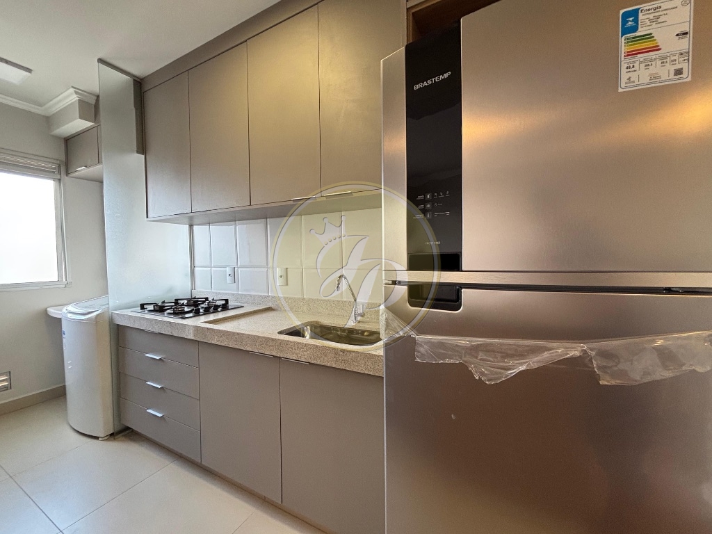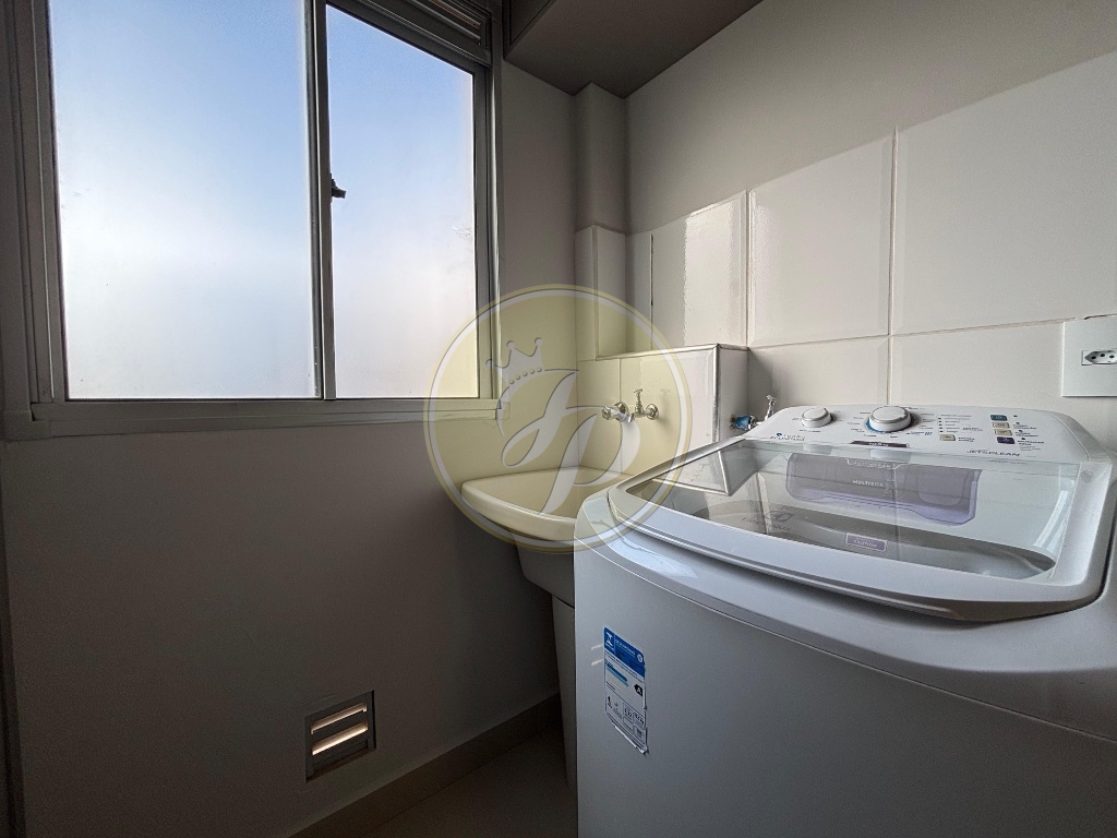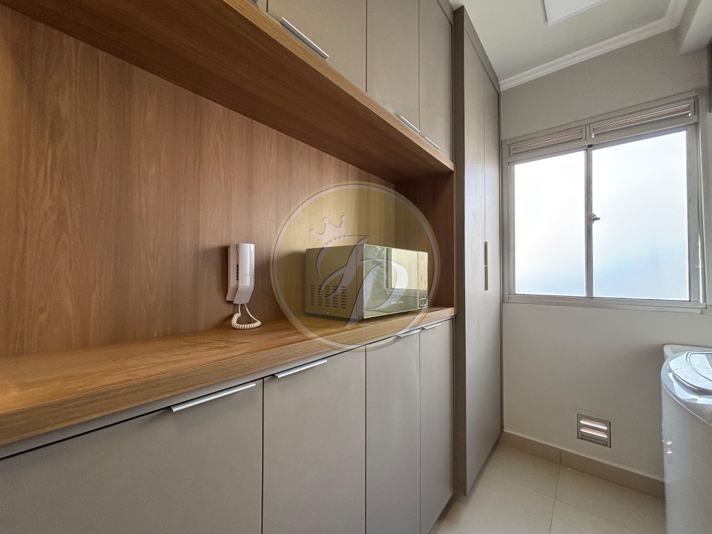 3 quartos (2 possuem armários planejados), sala de 2 ambientes com sacada; painel de TV e sofá, mesa de jantar, cozinha planejada equipada com geladeira, cooktop e microondas, área de serviço com máquina de lavar, vaga de garagem.