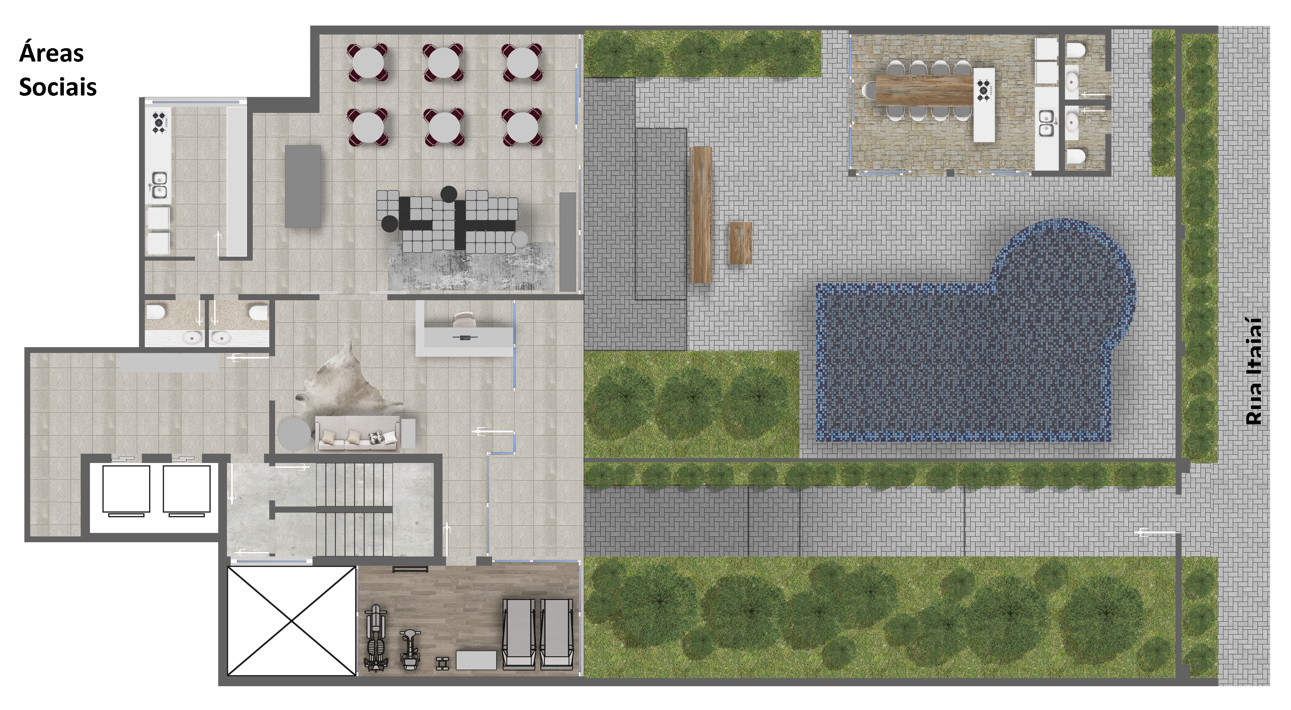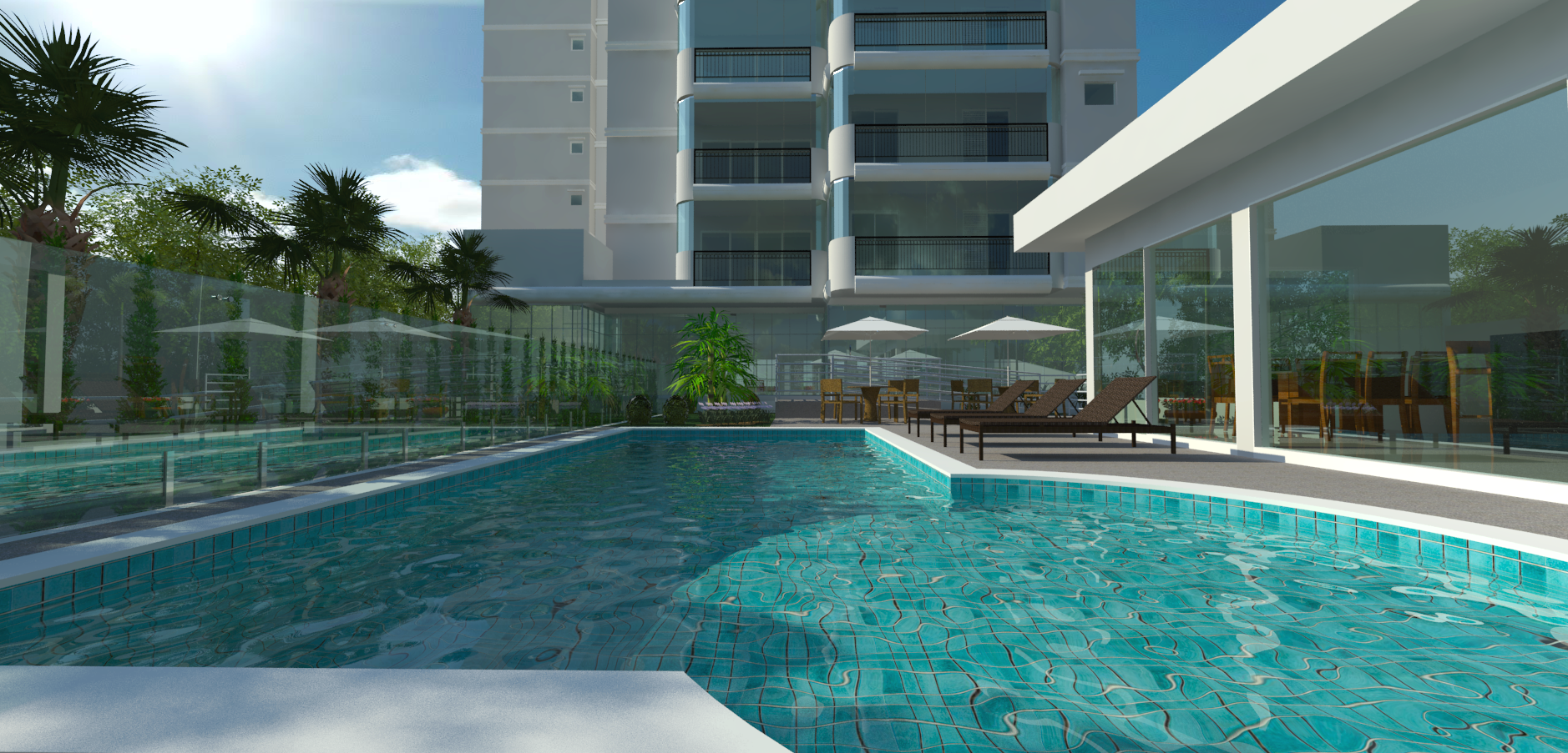 Estrutura de lazer completa com piscina, espaço gourmet com churrasqueira, salão de festas, cozinha de apoio e academia.