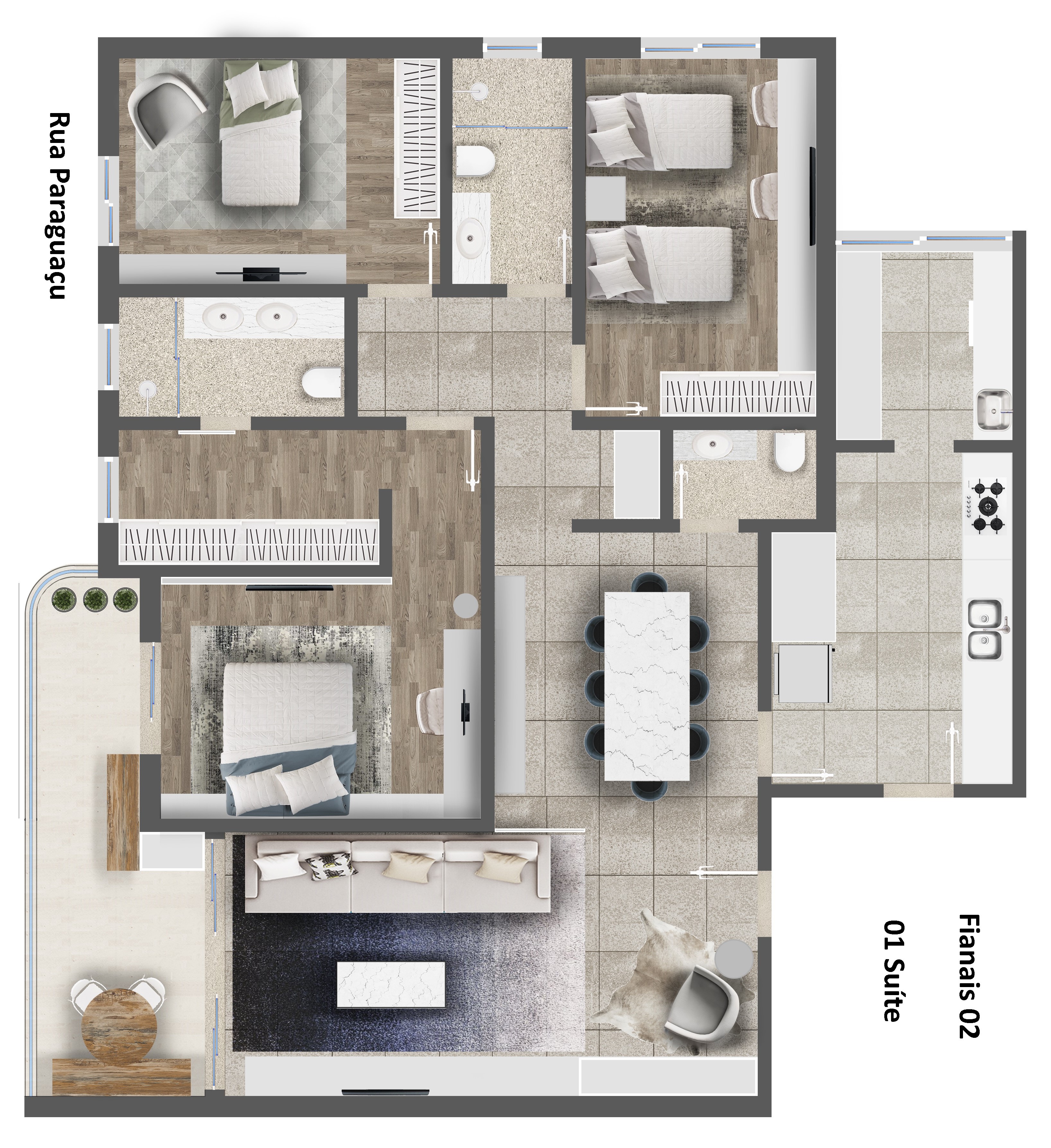 Apartamento tipo com aproximadamente 160 m² de área útil, nas opções de 3,2 ou 1 suite, com o banheiro social, sala, varanda com infra para churrasqueira a gás, cozinha, área de serviço, tubulação pronta para receber instalação de ar condicionado tipo Split, 2 vagas de garagem individuais. As paredes internas terão reboco onde houve instalação de esquadrias, chapisco no restante e a continuidade do acabamento será a definir pelo comprador que terá o prazo de seis meses para concluir o apartamento. A infraestrutura e cabeamento das instalações elétricas, telefônica, dados e hidráulicas, também instaladas.